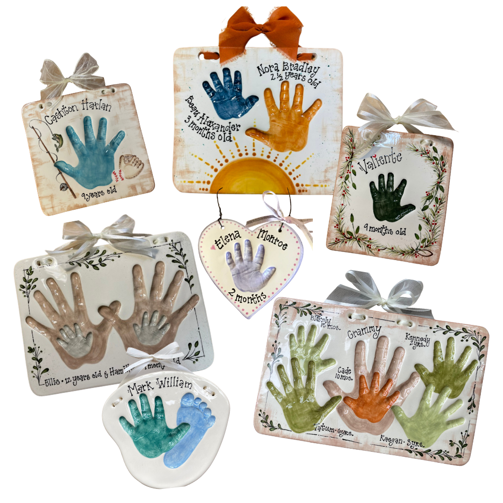 Clay impressions are a one-of-a-kind priceless keepsake. Each Impression is custom created to capture your child’s hands & feet whether in a birth plaque, ornament, sibling plaque, or Family plaque.